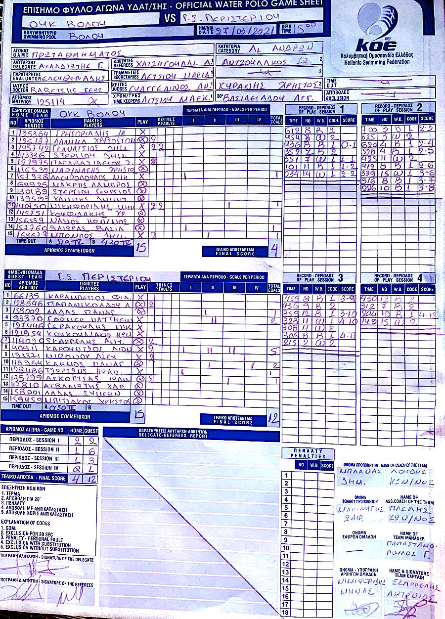 Ο ΓΣ Περιστέρι κυριάρχησε πλήρως (12-4) του ΟΥΚ Βόλου εκτός έδρας για την 7η αγωνιστική του πρωταθλήματος της Α1 υδατοσφαίρισης.