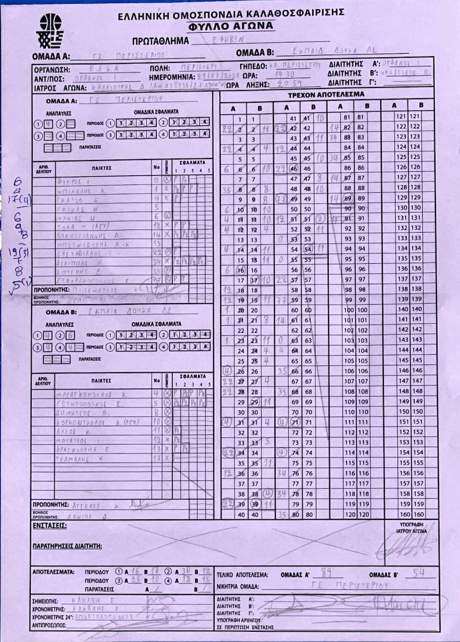 Περιστέρι (Παπαμάρκος): Γκάτζο 17 (4 τριπ.), Γκίκας, Μανιάς 6, Μπουντούρης, Ευσταθιάδης 19 (3 τριπ.), Φίλιππας 7, Ζούγρης 8, Σταυρακόπουλος 5 (1 τριπ.), Φύτρος 6, Τόλα 9, Μπιλάλης 4, Βλαχογιάννης 8